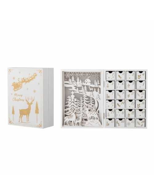 Il est équipé de lumières intégrées, créant un arrière-plan idyllique pour le compte à rebours jusqu'à Noël. Le calendrier se compose de 24 petits tiroirs, numérotés de 1 à 24, chacun décoré de motifs élégants en or et blanc. Ces tiroirs offrent une opportunité unique de personnaliser votre tradition de Noël en y plaçant de petits cadeaux, des friandises ou des salutations - un pour chaque jour jusqu'au réveillon de Noël.