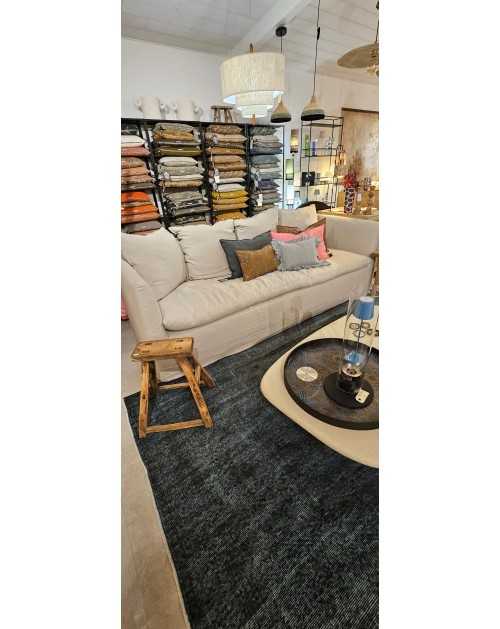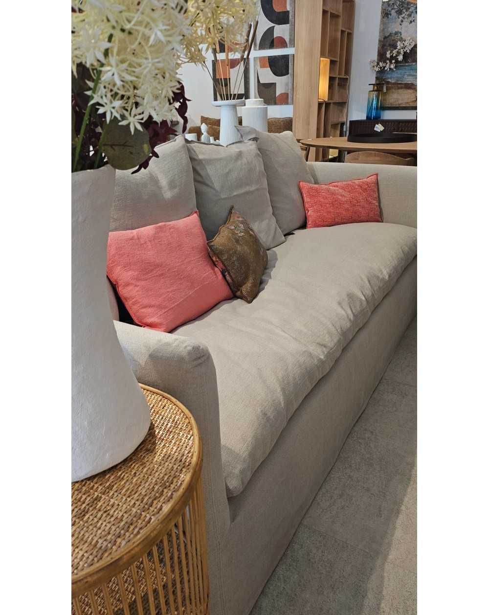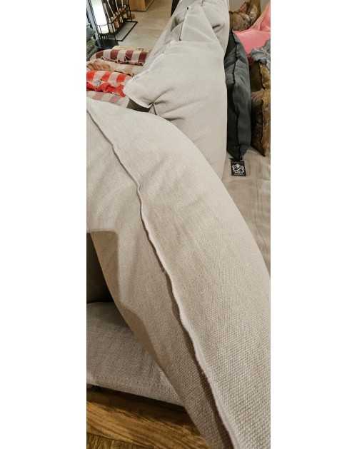 Coussin d'assise: constitué de plumes dans sachets anti-migration + couche inférieur en billes de silicone + coeur constitué de 2 plaques de mousse HR 16 kg/m3 et 23 kg/m3 (fabriqué en Bretagne)